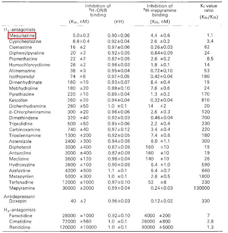 この結果だけを見ると、メキタジンは第二世代なのに第一世代よりも抗コリン作用が強めな感じ。