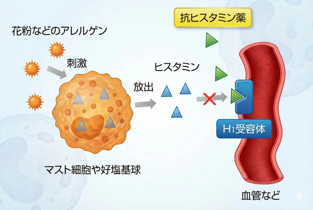 抗ヒスタミン薬はこのH1受容体を競合的にブロックします。